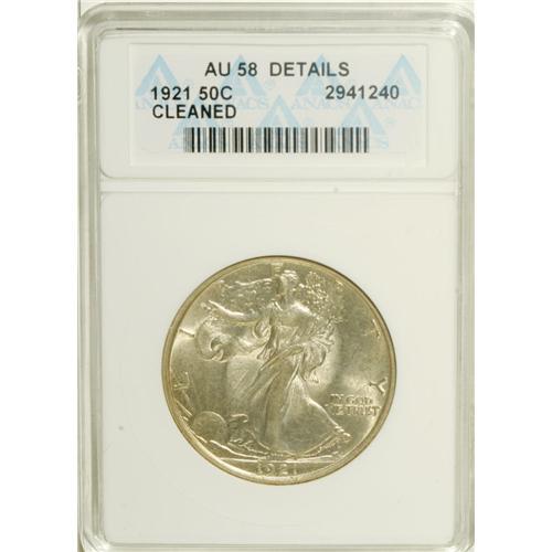 <B>1921 50C --Cleaned--ANACS. AU58 Details.</B></I> Only a few light hairlines betray a past mild cleaning, but much luster remains, and the overall presentation is pleasing. Slight highpoint rub confirms the details grade, but this coin is still desirable and would fit nicely into a Mint State set at a fraction of the price.<BR><BR><b>Shipping:</b> Coins & Currency (<a target="_blank" href="http://www.heritageauctions.com/common/shipping.php">view shipping information</a>)