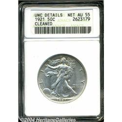 <B>1921<50C>--Cleaned--ANACS. Unc Details, Net AU55.</B></I> A high visibility issue because of both its low mintage (246,000 pieces) and the rarity of the Denver and San Francisco coins. The P-mint is the usual choice for collectors who are interested in a date-only set, as it is the least expensive of the three. The striking details on this smooth silver-gray example are quite bold, save for a hint of softness on the eagle's breast.<BR><I>From The Dennis Gundy Collection.</B></I> <BR><BR><B>Important notice:</B> Heritage usually auctions material at the rate of 200-250 lots per hour. On some occasions eBay Live bid software or the Internet may not be able to keep up with the pace of the auction. We recommend placing a realistic absentee bid now as insurance to avoid disappointment. Occasionally the auctioneer may eliminate or reject an eBay Live bid, and the auctioneer may also reopen a lot after the close of the eBay live bidding (usually because we missed an audience bid), and may reject your bid even if it shows you as the winning bidder. By bidding via eBay Live, you agree that Heritage may award the lot to another bidder at its sole discretion under the circumstances described above or any other reasonable circumstances. Since eBay bids are not shown to us until we open the lot on the floor, we treat those bids just like floor bids. In most cases the floor responds before the eBay bid is presented to us, due to Internet lag time, so for consistency we have made it a policy that floor bids are always considered first over tie eBay live bids. Also please note that all Heritage lots purchased through eBay Live carry a 20% Buyer's Premium. Please make sure you read the Terms and Conditions before you bid. </span></font></tr></table></td></tr></table>