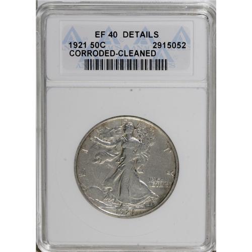 <B>1921 50C --Corroded, Cleaned--ANACS. XF40 Details.</B></I> A glossy, lightly worn example of this difficult issue. The reverse has several areas of chalky olive corrosion and the occasional dark spot.<BR><BR><b>Shipping:</b> Coin/Currency (<a target="_blank" href="http://www.heritageauctions.com/common/shipping.php">view shipping information</a>)