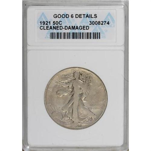 <B>1921 50C --Cleaned, Damaged--ANACS. Good 6 Details.</B></I> NGC Census: (32/359). PCGS Population (60/538). Mintage: 246,000. Numismedia Wsl. Price for NGC/PCGS coin in G6 : $152. (#6583)<BR><BR><B>Coin Engraver:</B> Adolph A. Weinman<BR><BR><b>Shipping:</b> Coins & Currency (<a target="_blank" href="http://www.heritageauctions.com/common/shipping.php">view shipping information</a>)