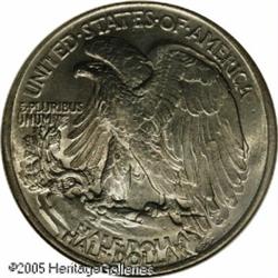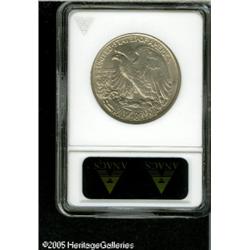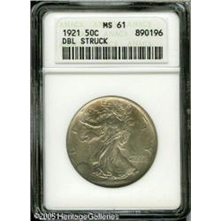 <B>1921 50C MS61 Double Struck ANACS.</B></I> It is rare enough when we are able to offer a Mint State example of this scarce, key date Walking Liberty Half, however, this piece exhibits an essentially unique double struck appearance on each side. Apparently, the coin failed to eject from the dies after the initial strike and rotated slightly counterclockwise before being struck again. Pronounced doubling is seen at the lower peripheral areas and on the eagle's feathers. The date, designer's initials, and HALF DOLLAR are virtually separated from the initial striking.<BR> Swirls of subtle golden patina decorate the minimally marked surfaces. The luster is full and quite frosty for the issue and the strike is unusually sharp for a coin the was twice impressed. We can only theorize about the possibility of a similar coin in existence, but if another was made, we seriously doubt if it still remains in Mint State. Worth a close examination by both the serious Half Dollar collector, and / or the error specialist. Lot:7981