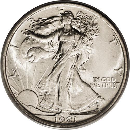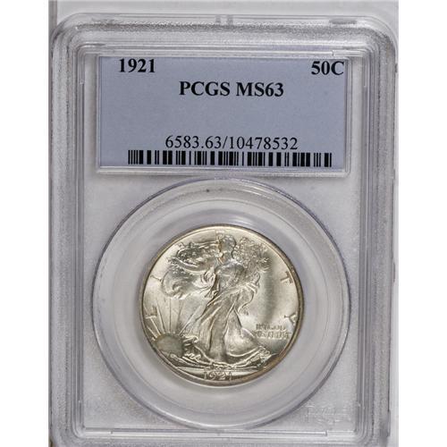 <B>1921<50C> MS63 PCGS.</B></I> Radiant luster pervades both sides of this enticing example, with silver-white, untoned surfaces and excellent eye appeal. While a few stray undistracting abrasions confirm the Select grade, the strike is considerably better than usual through the centers. A nice piece for the grade, and deserving of strong bidding.