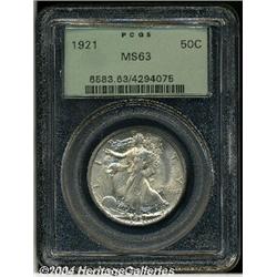 <B>1921<50C> MS63 PCGS.</B></I> This is an uncommonly desirable coin for the grade, and an important Select representative of this key P-mint Walker. The sharp strike is free of criticism, and the surfaces are problem-free save for a few light luster grazes on the obverse and reverse. Lightly tinged in silver-gray iridescence.<BR><I>From The Gene Holland Collection of United States Coins, Part One.</B></I> <BR><BR><B>Important notice:</B> Heritage usually auctions material at the rate of 200-250 lots per hour. On some occasions eBay Live bid software or the Internet may not be able to keep up with the pace of the auction. We recommend placing a realistic absentee bid now as insurance to avoid disappointment. Occasionally the auctioneer may eliminate or reject an eBay Live bid, and the auctioneer may also reopen a lot after the close of the eBay live bidding (usually because we missed an audience bid), and may reject your bid even if it shows you as the winning bidder. By bidding via eBay Live, you agree that Heritage may award the lot to another bidder at its sole discretion under the circumstances described above or any other reasonable circumstances. Since eBay bids are not shown to us until we open the lot on the floor, we treat those bids just like floor bids. In most cases the floor responds before the eBay bid is presented to us, due to Internet lag time, so for consistency we have made it a policy that floor bids are always considered first over tie eBay live bids. Also please note that all Heritage lots purchased through eBay Live carry a 20% Buyer's Premium. Please make sure you read the Terms and Conditions before you bid.