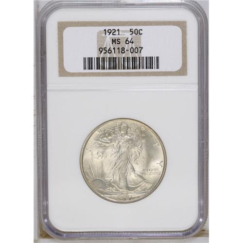 <B>1921 50C MS64 NGC.</B></I> The Pittman Act obligated the mint to strike vast quantities of silver dollars. This production came at the expense of other circulating denominations. The half dollar was especially affected. The combined mintage of the 1921, 1921-D, and 1921-S barely exceeded 1 million pieces. The 1921 mintage of 246,000 pieces is the second lowest of the type, behind only the 208,000 pieces struck at Denver. This lustrous and lightly toned near-Gem has a decent strike, since the thumb on the branch hand is distinct. Well preserved aside from a few faint grazes on the right obverse field. One of the keys to the series, and seldom seen in such quality.<BR><BR><b>Shipping:</b> Coin/Currency (<a target="_blank" href="http://www.heritageauctions.com/common/shipping.php">view shipping information</a>)