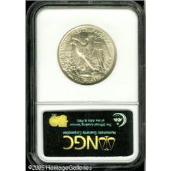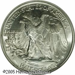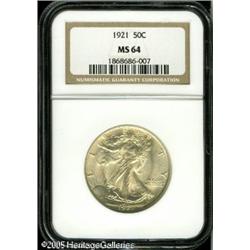 <B>1921 50C MS64 NGC.</B></I> While even scarcer than the more fabled 1921-S in circulated grades, the 1921-P is not quite as challenging as the S-mint in Uncirculated condition. It is, nevertheless, a difficult coin and one that cannot be overlooked by the serious collector of early Walking Liberty halves. This is an especially lustrous, vibrant coin that shows full striking details on the obverse. Essentially brilliant, when one closely examines the surfaces there is just a trace of pale patina in evidence. There are no obvious abrasions on either side of this lovely near-Gem. Population: 76 in 64, 32 finer (1/05). Lot:7983