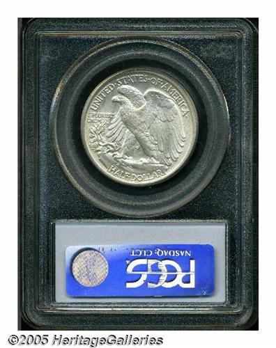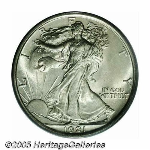 <B>1921<50C> MS64 PCGS.</B></I> Most serious numismatists will recognize the importance of this opportunity. All of the 1921 Walking Liberty Half Dollars, from each of the three mints, are rare and in demand, especially in Choice and Gem Mint State grades. The 1921 Philadelphia and Denver Mint issues are the lowest mintage dates of the series, with 246,000 and 208,000 coined, respectively. There is no doubt that the population data includes numerous resubmissions, for these coins are much more difficult than the modest figures suggest. This is a Choice example with sharp design elements including nearly full "thumb" details at the center of the obverse. The surfaces have satiny silver luster and are essentially brilliant, although some might suggest that faint champagne toning is present. Population: 91 in 64, 64 finer (5/05).