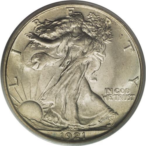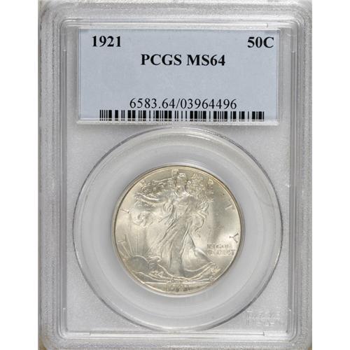 <B>1921 50C MS64 PCGS.</B></I> This offering presents an extremely important opportunity for the advanced collector to add a rarity as the present specimen has only a few peers in the context of the Walking Liberty series. A few slight abrasions on each side prevent a higher grade, yet the frosty surfaces are fully lustrous with a hint of champagne toning. Population: 82 in 64, 51 finer (2/07).<BR><BR><b>Shipping:</b> Coins & Currency (<a target="_blank" href="http://www.heritageauctions.com/common/shipping.php">view shipping information</a>)