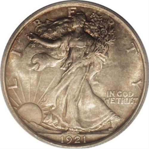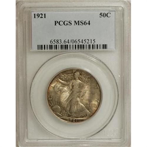 <B>1921 50C MS64 PCGS.</B></I> Boasting the second lowest mintage in the series, second only to its D-mint counterpart, the 1921 is correctly regarded as one of the most challenging Walking Liberty issues in all grades. This Choice, original example is very well defined beneath swirling gunmetal, orange, and violet shades. A glass is required to locate trivial signs of contact on the central devices. Population: 85 in 64, 51 finer (7/07).<BR><BR><B>Coin Engraver:</B> Adolph A. Weinman<BR><BR><b>Shipping:</b> Coins & Currency (<a target="_blank" href="http://www.heritageauctions.com/common/shipping.php">view shipping information</a>\)