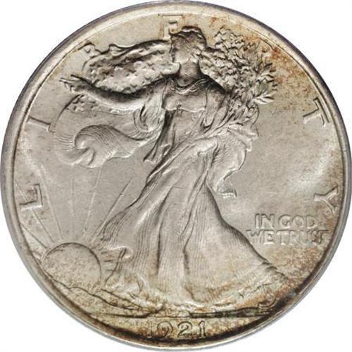 <B>1921 50C MS64 PCGS.</B></I> A remarkable near-Gem with extraordinary eye appeal for the grade, this piece has frosty silver luster with splashes of gold and iridescent toning, mostly on the obverse. Few survivors from the mintage of 246,000 coins can equal this piece for its desirability. The PCGS <I>Population Report</B></I> shows that just 51 finer pieces are certified.<BR><BR><B>Coin Engraver:</B> Adolph A. Weinman<BR><BR><b>Shipping:</b> Coins & Currency (<a target="_blank" href="http://www.heritageauctions.com/common/shipping.php">view shipping information</a>)