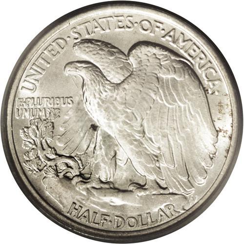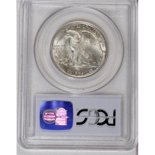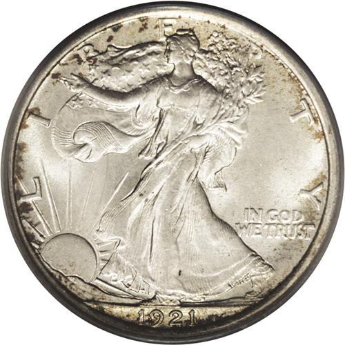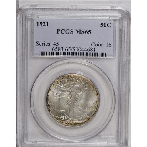 <B>1921<50C> MS65 PCGS.</B></I> Nearly a quarter-million pieces were struck of the 1921-P half. That is the second-lowest mintage in the entire series, but more high grade pieces seem to have been saved than of the 1921-D and S, which are much more expensive in Uncirculated condition. The sharp strike produces a fully split thumb on Liberty's branch hand, and good detailing on the head and the eagle. The surfaces are mostly brilliant, with occasional daubs of deep russet and blue-green around the peripheries. The satiny surfaces show no noticeable abrasions on either side. Population: 61 in 65, 3 finer (9/06).