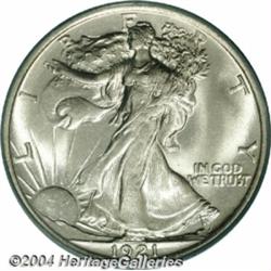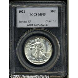 <B>1921<50C> MS65 PCGS.</B></I> The three issues from 1921 stand out from the rest of the Walking Liberty series because of their uncommonly low mintages, and the fact that relatively few were spared from decades of circulation. Just 246,000 pieces were struck of the P-mint and today's collectors eagerly seek out even an attractive mid-grade example. The Gem example offered here is one of just a handful to have survived in this outstanding state of preservation. Not only are the shimmering, satiny fields virtually free from all but the slightest blemishes, but the central devices are boldly struck down to the finest detail. A fully brilliant, snow-white appearance is presented over each side. Light magnification is required to detect a few pinpoint marks on Liberty cheek, lower leg, and right obverse field, the only appreciable signs of contact on this memorable 1921 Walker. Despite the listed population figures, this is one of the finest 1921 Halves we can recall cataloging in quite some time. Population: 55 in 65, 4 finer (3/04).<BR><I>From the JFS Collection.</B></I> <BR><BR><B>Important notice:</B> Heritage usually auctions material at the rate of 200-250 lots per hour. On some occasions eBay Live bid software or the Internet may not be able to keep up with the pace of the auction. We recommend placing a realistic absentee bid now as insurance to avoid disappointment. Occasionally the auctioneer may eliminate or reject an eBay Live bid, and the auctioneer may also reopen a lot after the close of the eBay live bidding (usually because we missed an audience bid), and may reject your bid even if it shows you as the winning bidder. By bidding via eBay Live, you agree that Heritage may award the lot to another bidder at its sole discretion under the circumstances described above or any other reasonable circumstances. Since eBay bids are not shown to us until we open the lot on the floor, we treat those bids just like floor bids. In most cases the floor responds before the eBay bid is presented to us, due to Internet lag time, so for consistency we have made it a policy that floor bids are always considered first over tie eBay live bids. Also please note that all Heritage lots purchased through eBay Live carry a 20% Buyer's Premium. Please make sure you read the Terms and Conditions before you bid. </span></font></tr></table></td></tr></table>