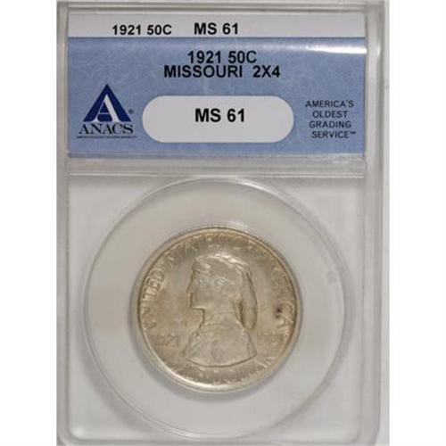 <B>1921 50C Missouri 2x4 MS61 ANACS.</B></I> A dusky and luminous survivor with soft peach-gold toning over predominantly silver-gray surfaces. Well struck with no trace of wear, though a number of wispy abrasions are present on and around the portrait.<BR><BR><b>Shipping:</b> Coins & Currency (<a target="_blank" href="http://www.heritageauctions.com/common/shipping.php">view shipping information</a>)