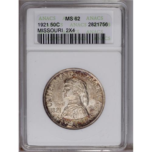 <B>1921<50C> Missouri 2x4 MS62 ANACS.</B></I> Richly and originally toned in swirls of honey-tan, copper-russet, and blue-green color. Well struck with slightly subdued luster and pleasing surfaces. A seemingly conservatively graded example.
