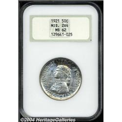 <B>1921<50C> Missouri 2x4 MS62 NGC.</B></I> A crescent of deep brown and blue occupies the upper obverse, the remaining surfaces being mostly brilliant. A few light scattered marks account for the grade. <BR><BR><B>Important notice:</B> Heritage usually auctions material at the rate of 200-250 lots per hour. On some occasions eBay Live bid software or the Internet may not be able to keep up with the pace of the auction. We recommend placing a realistic absentee bid now as insurance to avoid disappointment. Occasionally the auctioneer may eliminate or reject an eBay Live bid, and the auctioneer may also reopen a lot after the close of the eBay live bidding (usually because we missed an audience bid), and may reject your bid even if it shows you as the winning bidder. By bidding via eBay Live, you agree that Heritage may award the lot to another bidder at its sole discretion under the circumstances described above or any other reasonable circumstances. Since eBay bids are not shown to us until we open the lot on the floor, we treat those bids just like floor bids. In most cases the floor responds before the eBay bid is presented to us, due to Internet lag time, so for consistency we have made it a policy that floor bids are always considered first over tie eBay live bids. Also please note that all Heritage lots purchased through eBay Live carry a 20% Buyer's Premium. Please make sure you read the Terms and Conditions before you bid.