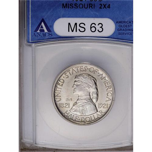 1921 50C Missouri 2x4 MS63 ANACS. A pleasing Mint Stat 1921[50C] Missouri 2x4 MS63 ANACS.