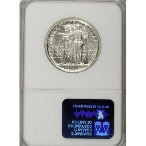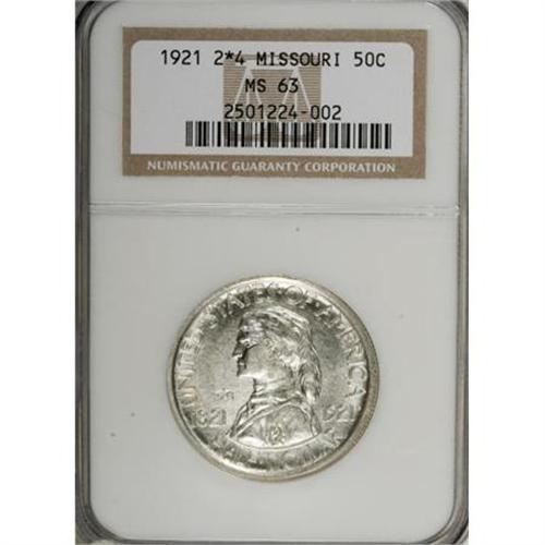 <B>1921 50C Missouri 2</B></I> S<B>4 MS63 NGC.</B></I> Select and well struck with a predominantly silver-white obverse and faintly blue-tinged reverse margins. Light, scattered abrasions appear on both sides of this lower-mintage Missouri variant.<BR><BR><b>Shipping:</b> Coins & Currency (<a target="_blank" href="http://www.heritageauctions.com/common/shipping.php">view shipping information</a>)