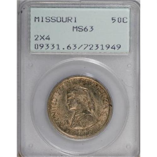 <B>1921 50C Missouri 2</B></I> S<B>4 MS63 PCGS.</B></I> A well struck and luminous Select example of this low-mintage Missouri variant, gold-gray with faint tan accents. Light, scattered abrasions on each side account for the grade.<BR><BR><b>Shipping:</b> Coins & Currency (<a target="_blank" href="http://www.heritageauctions.com/common/shipping.php">view shipping information</a>)