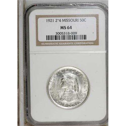 <B>1921 50C Missouri 2x4 MS64 NGC.</B></I> A satiny and nicely struck example of this scarce and low mintage variety. The right reverse rim has russet-gray freckles, although both sides are otherwise untoned.<BR><BR><b>Shipping:</b> Coins & Currency (<a target="_blank" href="http://www.heritageauctions.com/common/shipping.php">view shipping information</a>)