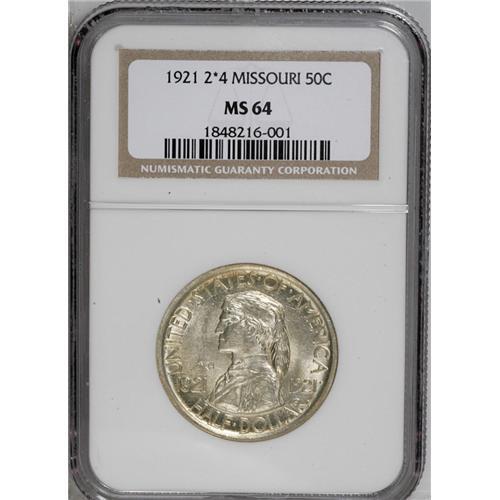 <B>1921<50C> Missouri 2x4 MS64 NGC.</B></I> In promotional materials and in such an authority as the <I>Guide Book,</B></I> a mintage of 5,000 pieces is listed for this variety, though others dispute this figure. A nicely detailed, lustrous, and largely untoned example.