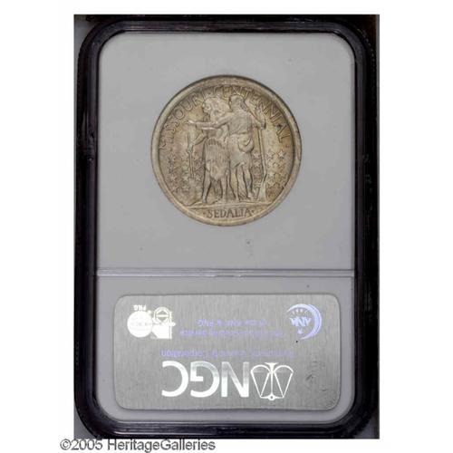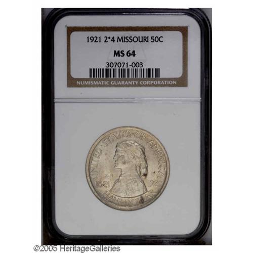 <B>1921<50C> Missouri 2x4 MS64 NGC.</B></I> This lustrous apricot-gray near-Gem has a good strike and unmarked surfaces. A couple of russet freckles are noted on the second L in DOLLAR and the base of the coonskin cap's tail. A scarce issue.