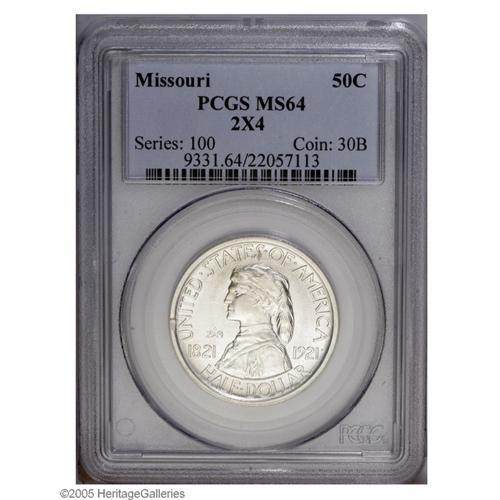 <B>1921<50C> Missouri 2x4 MS64 PCGS.</B></I> Brilliant white and flashy with minimally abraded surfaces and a normal strike for the issue. A small reverse edge flaw is noted between nine and ten o'clock.