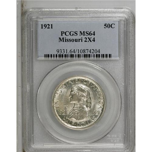<B>1921 50C Missouri 2x4 MS64 PCGS.</B></I> Choice and typically struck, this piece has silver-gray patina on each side and somewhat subdued luster. An appealing example of this low-mintage variety, one of just 5,000 pieces coined.<BR><BR><b>Shipping:</b> Coin/Currency (<a target="_blank" href="http://www.heritageauctions.com/common/shipping.php">view shipping information</a>)
