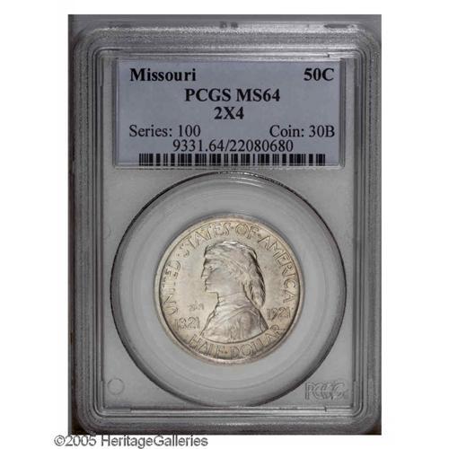 <B>1921<50C> Missouri 2x4 MS64 PCGS.</B></I> Fully struck with a pleasing satiny sheen over untoned, nearly pristine surfaces. Long regarded as a key issue in the silver commemorative series, the Missouri 2x4 is a very elusive issue in or near Gem condition.