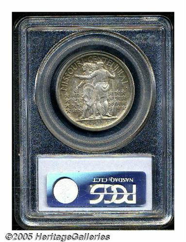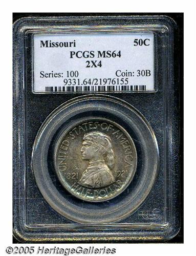 <B>1921<50C> Missouri 2x4 MS64 PCGS.</B></I> Lovely near-Gem example with rings of green, blue and violet. Well impressed designs, with no singularly notable imperfections.