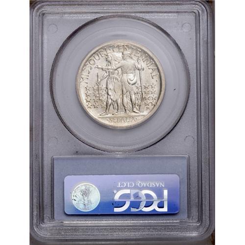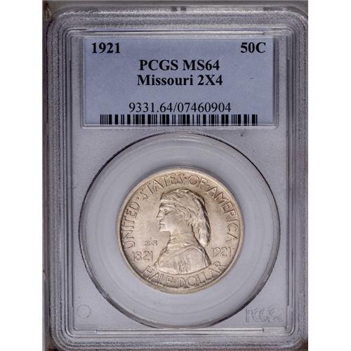 <B>1921<50C> Missouri 2x4 MS64 PCGS.</B></I> The obverse has a light reddish-gold cast, while the reverse is brilliant silver-white. The strike is soft on the strap going up the frontiersman's back, as usually seen, and a couple of small, undistracting ticks are noted on the cheek on the obverse. A popular, scarce issue in the commemorative series.
