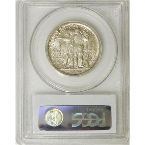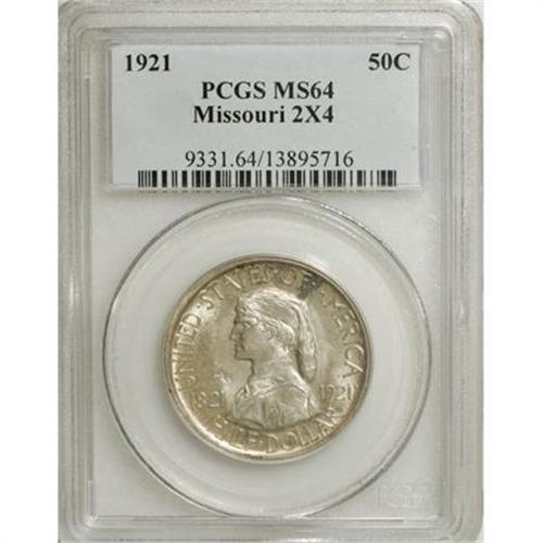 <B>1921 50C Missouri 2x4 MS64 PCGS.</B></I> Though the 2x4 pieces were the first off the coining press, this low-mintage variety was not the one offered to fairgoers in Sedalia, site of the state fair. A commemorative collector likely purchased this toned near-Gem, softly lustrous with gold and heather patina overall and small streaks of sage toning at the margins.<BR><I>From The Frank DuVall Collection of U.S. Commemoratives.</B></I><BR><BR><b>Shipping:</b> Coins & Currency (<a target="_blank" href="http://www.heritageauctions.com/common/shipping.php">view shipping information</a>)