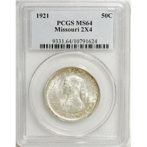 <B>1921 50C Missouri 2x4 MS64 PCGS.</B></I> This lower mintage variant is a frosty silver-gray with delicate golden peripheral accents. A number of shallow luster grazes on the obverse limit the grade.<BR><BR><b>Shipping:</b> Coins & Currency (<a target="_blank" href="http://www.heritageauctions.com/common/shipping.php">view shipping information</a>)