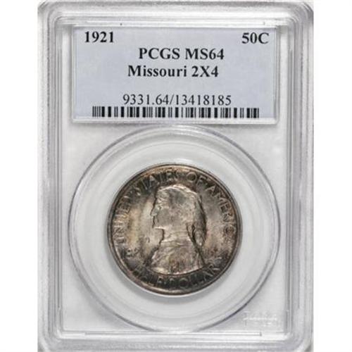 <B>1921 50C Missouri 2</B></I> S<B>4 MS64 PCGS.</B></I> Deeply toned in shades of charcoal-gray, violet, and forest-green. Pleasing satin luster and boldly defined motifs are evident on each side. The 2 S4 variety is a scarce key issue in the silver commemorative series. <BR><BR><b>Shipping:</b> Coins & Currency (<a target="_blank" href="http://www.heritageauctions.com/common/shipping.php">view shipping information</a>)