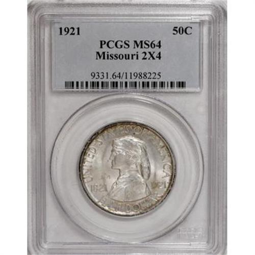 <B>1921 50C Missouri 2x4 MS64 PCGS.</B></I> Red-gold and olive-green patina hugs the margins of this highly lustrous commemorative. Sharply struck, and devoid of significant marks.<BR><I>From The John Stimson, Sr. Collection, Part Two.</B></I><BR><BR><b>Shipping:</b> Coins & Currency (<a target="_blank" href="http://www.heritageauctions.com/common/shipping.php">view shipping information</a>)