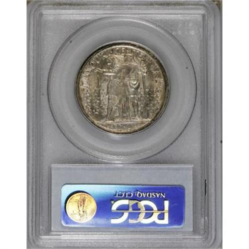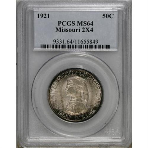 <B>1921 50C Missouri 2x4 MS64 PCGS.</B></I> The jade-green and russet-gold shadings are most prominent near the rims. A satiny and suitably struck near-Gem with minimal field contact. A difficult statehood type.<BR><BR><b>Shipping:</b> Coins & Currency (<a target="_blank" href="http://www.heritageauctions.com/common/shipping.php">view shipping information</a>)