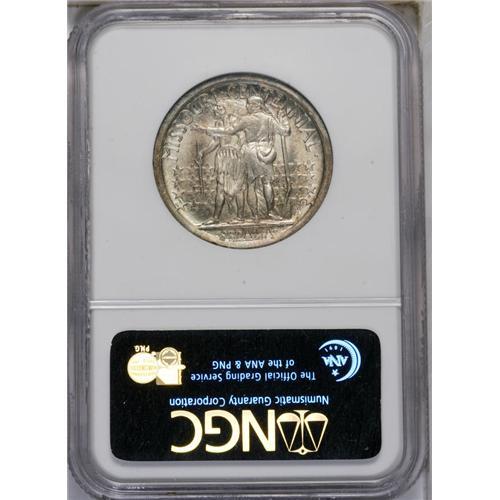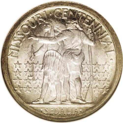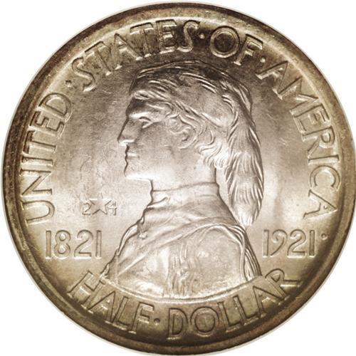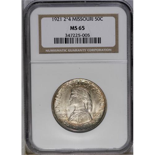 <B>1921<50C> Missouri 2x4 MS65 NGC.</B></I> Sunset-golden and sky-blue colors intermingle over each side of this lustrous, minimally marked specimen. The strike is above average with good detail showing over the ear of the frontiersman on the obverse. An original, carefully preserved specimen.