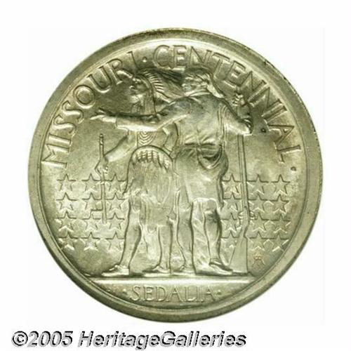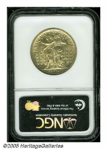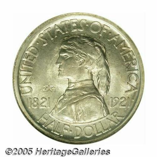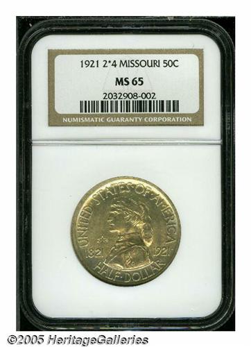<B>1921<50C> Missouri 2x4 MS65 NGC.</B></I> This is an outstanding example with pale golden toning on both sides. The usual weakness that is seen on both the obverse and the reverse is not readily apparent on this coin. While a moderate number of Gem MS65 examples have been certified, finer coins are almost never seen. Population: 176 in 65, 5 finer (5/05).