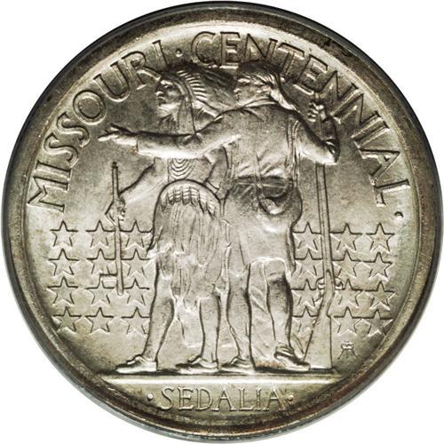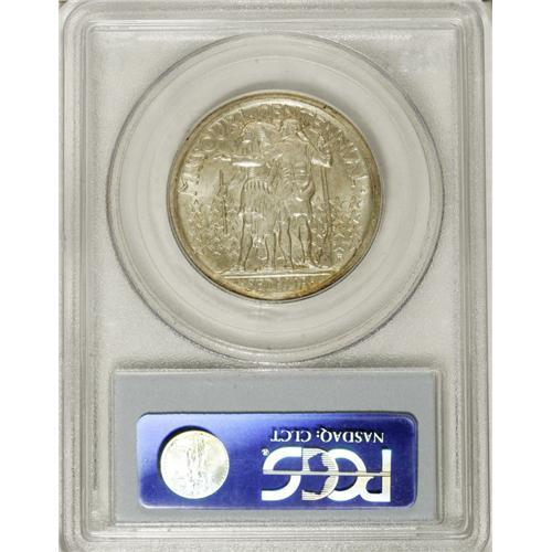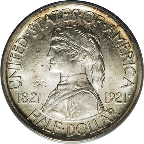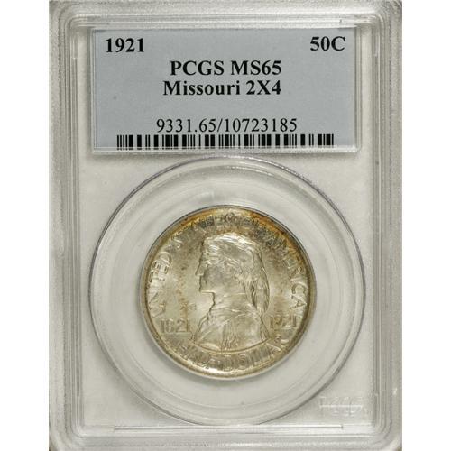 <B>1921 50C Missouri 2x4 MS65 PCGS.</B></I> A well struck Gem example of the scarcer Missouri variety. The obverse has ice-blue and golden toning with a crescent of deeper orange at the upper obverse periphery, while the reverse possesses similar colors, albeit with less gold. Pleasing and softly lustrous with minimal marks.<BR><BR><b>Shipping:</b> Coins & Currency (<a target="_blank" href="http://www.heritageauctions.com/common/shipping.php">view shipping information</a>)