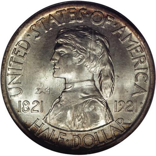 <B>1921 50C Missouri 2x4 MS65 PCGS.</B></I> Although this coin was issued to commemorate the centennial of Missouri's admission into the Union in 1821, the portrait of Daniel Boone makes this commemorative half equally popular among collectors in Virginia, Tennessee, and Kentucky. Boone was an early American frontiersman and legendary hero who helped blaze a trail through the Cumberland Gap, a notch in the Appalachian Mountains near the juncture of those states. The incused 2*4 indicates that Missouri was the 14th state to join the Union. This silvery Gem piece offers light peripheral lilac and gold color, with superb eye appeal. PCGS has certified only 15 coins finer (12/06).<BR><BR><b>Shipping:</b> Coin/Currency (<a target="_blank" href="http://www.heritageauctions.com/common/shipping.php">view shipping information</a>)