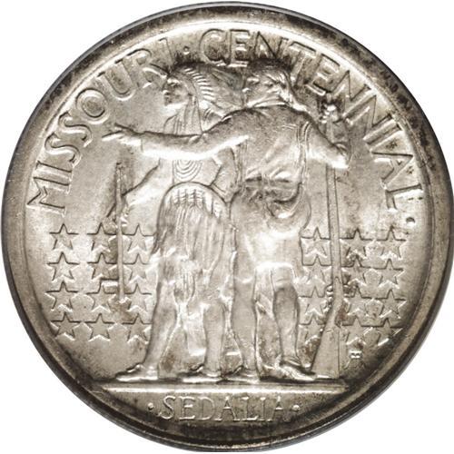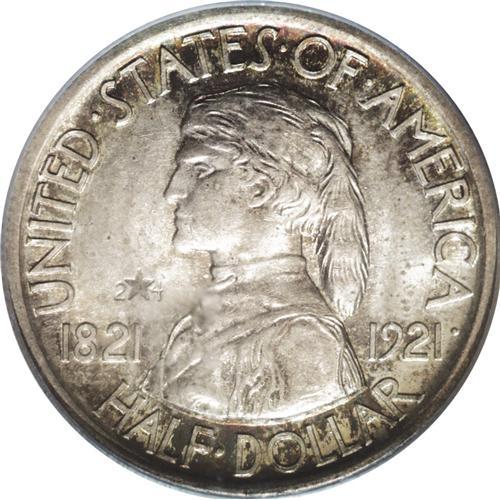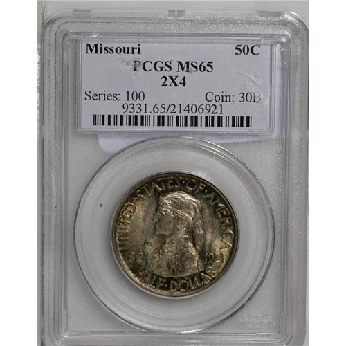 <B>1921<50C> Missouri 2x4 MS65 PCGS.</B></I> This original Gem combines a low production of 5,000 pieces with an elusive MS65 designation. The reverse displays a light amount of slightly mottled champagne-tan patina over suitably impressed features. The obverse is equally well defined with variegated hues of crimson, blue, green, and gold noted throughout. As befits the grade, there are just a couple of tiny contact marks on the obverse. This is a memorable piece whose aesthetic beauty complements its technical quality.
