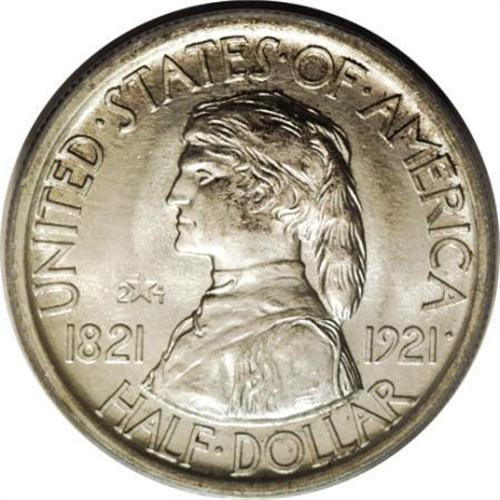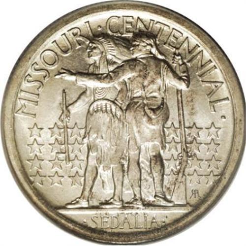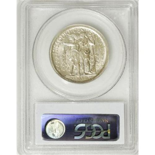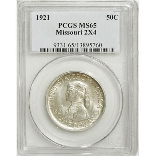 <B>1921 50C Missouri 2x4 MS65 PCGS.</B></I> Lightly die clashed above Boone's shoulder on the reverse, the "Shoulder Strap" variety. A hint of reddish patina graces the fields of this lustrous half, while the outer regions are silver-white with a touch of gray. This well struck example comes from the 2x4 variety, which was struck before the "plain" version but sold later, after the State Fair in Sedalia closed for the year. PCGS has graded just 21 coins finer (6/07).<BR><I>From The Frank DuVall Collection of U.S. Commemoratives.</B></I><BR><BR><b>Shipping:</b> Coins & Currency (<a target="_blank" href="http://www.heritageauctions.com/common/shipping.php">view shipping information</a>)