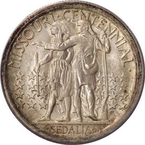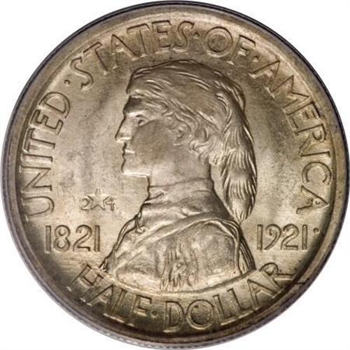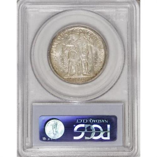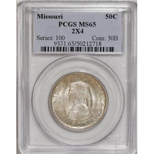 <B>1921 50C Missouri 2x4 MS65 PCGS.</B></I> Richly sculptural surfaces display a touch of light Champagne-gold patina; enough to warm up the frosty luster a bit. The design elements are sharply struck, though minor softness is noted on the frontiersman's cap. A more appealing example than most of the representatives of the issue. Like its "plain" counterpart, the Missouri 2x4 is one of the more challenging issues in Gem in the classic commemorative series. Population: 261 in 65, 25 finer (11/07).<BR><BR><b>Shipping:</b> Coins & Currency (<a target="_blank" href="http://www.heritageauctions.com/common/shipping.php">view shipping information</a>)