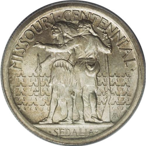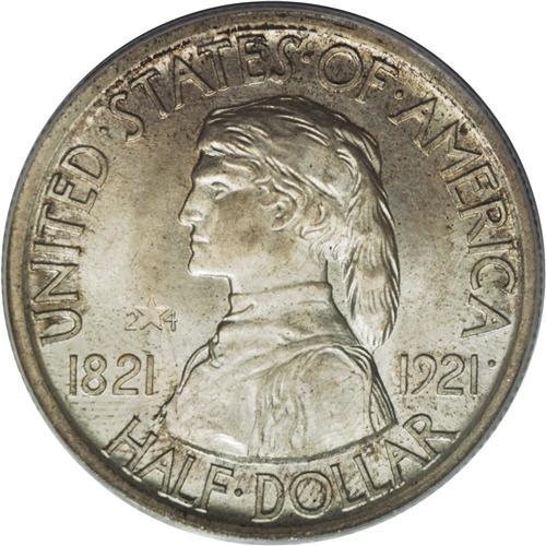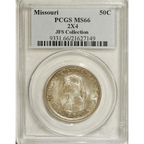 <B>1921 50C Missouri 2x4 MS66 PCGS.</B></I> Ex: JFS Collection. Among the interesting features of the Missouri halves is the use of incuse lettering for the name of the town that hosted the fair, Sedalia. Such incuse lettering is the first appearance on a commemorative, discounting designers' monograms and variety-creating punches. On the other hand, the second incuse feature of this coin, the eponymous 2x4 punch, commands more immediate attention.<BR> Like its "plain" counterpart, the Missouri 2x4 is difficult to locate in Gem condition, and anything finer is a condition rarity. The example offered here has pale blue and lavender patina over satiny surfaces. The strike is above-average and displays most of the strap attached to the frontiersman's supply bag. Exceptionally appealing and vastly superior to the typical 2x4 half. Neither NGC nor PCGS has certified any numerically finer examples (3/07).<BR><I>From The Cary & Cheryl Porter Collection.</B></I><BR><BR><b>Shipping:</b> Coins & Currency (<a target="_blank" href="http://www.heritageauctions.com/common/shipping.php">view shipping information</a>)