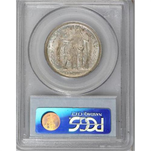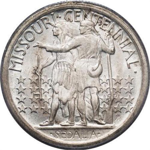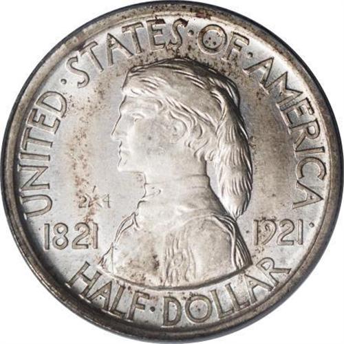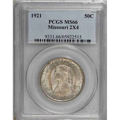 <B>1921 50C Missouri 2x4 MS66 PCGS.</B></I> The simple Robert Aitken design for the Missouri centennial commemorative is suggestive of the earliest commemoratives struck by the United States, the Columbia half and Isabella quarter. Other than UNITED STATES OF AMERICA, the dual dates, and the denomination, no other federal statutory inscriptions appear on either side. A small subset of pieces, however, display an extraneous design element: the eponymous 24 in the left obverse field, the digits separated by a star.<BR> This subtly shimmering 2x4 Missouri half offers delicate sky-blue patina over much of each side, while partial rings of reddish-tan form a halo around the portrait and similar toning appears over parts of the stars on the reverse. Though the standing frontiersman shows the typical softness at the strap on his back, the devices are pleasingly defined otherwise, and the overall eye appeal is excellent. Neither NGC nor PCGS has graded a finer representative (9/07).<BR><BR><b>Shipping:</b> Coins & Currency (<a target="_blank" href="http://www.heritageauctions.com/common/shipping.php">view shipping information</a>)