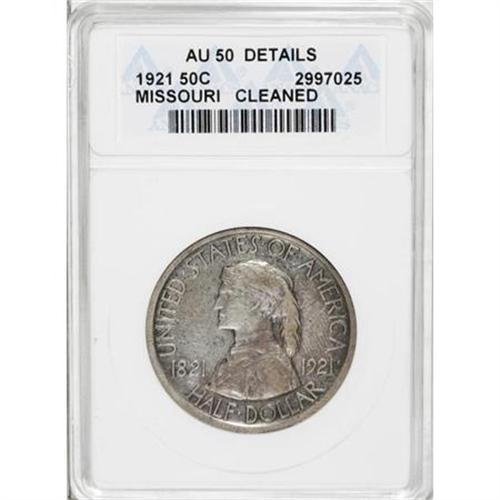 <B>1921 50C Missouri--Cleaned--ANACS. AU50 Details.</B></I> NGC Census: (0/1706). PCGS Population (6/1866). Mintage: 15,428. Numismedia Wsl. Price for NGC/PCGS coin in AU50: $322. (#9330)<BR><BR><b>Shipping:</b> Coins & Currency (<a target="_blank" href="http://www.heritageauctions.com/common/shipping.php">view shipping information</a>\)