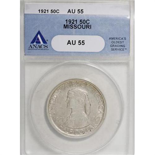 <B>1921 50C Missouri AU55 ANACS.</B></I> NGC Census: (7/1714). PCGS Population (35/1848). Mintage: 10,428. Numismedia Wsl. Price for NGC/PCGS coin in AU55: $330. (#9330)<BR><BR><b>Shipping:</b> Coins & Currency (<a target="_blank" href="http://www.heritageauctions.com/common/shipping.php">view shipping information</a>)