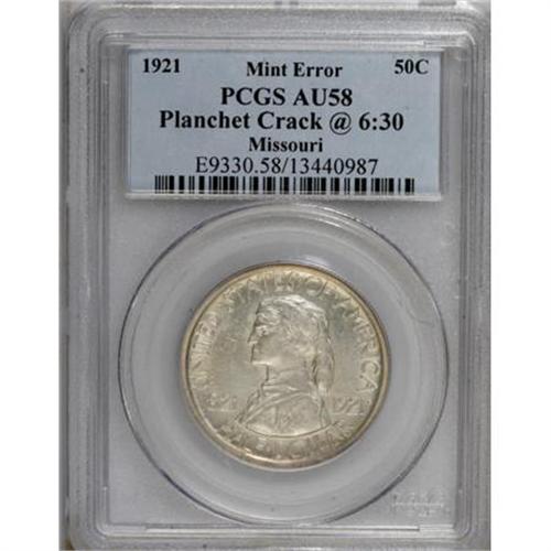 <B>1921 50C Missouri Half Dollar--Planchet Crack at 6:30--AU58 PCGS.</B></I> <BR><BR><b>Shipping:</b> Coins & Currency (<a target="_blank" href="http://www.heritageauctions.com/common/shipping.php">view shipping information</a>)