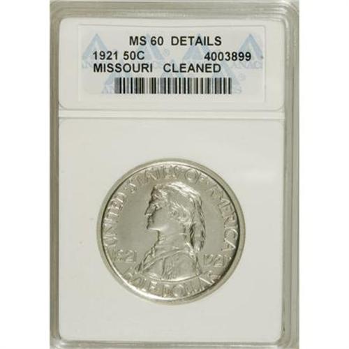 <B>1921 50C Missouri--Cleaned--ANACS. MS60 Details.</B></I> NGC Census: (5/1661). PCGS Population (17/1698). Mintage: 15,428. Numismedia Wsl. Price for NGC/PCGS coin in MS60: $570. (#9330)<BR><BR><b>Shipping:</b> Coins & Currency (<a target="_blank" href="http://www.heritageauctions.com/common/shipping.php">view shipping information</a>)