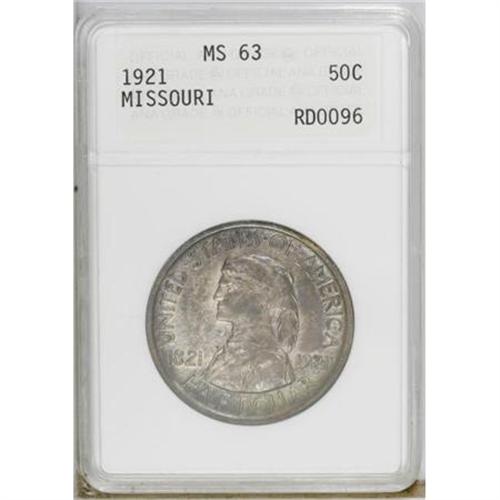 <B>1921 50C Missouri MS63 ANACS.</B></I> NGC Census: (325/1198). PCGS Population (473/1011). Mintage: 10,428. Numismedia Wsl. Price for NGC/PCGS coin in MS63: $775. (#9330)<BR><BR><b>Shipping:</b> Coins & Currency (<a target="_blank" href="http://www.heritageauctions.com/common/shipping.php">view shipping information</a>)