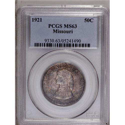 <B>1921<50C> Missouri MS63 PCGS.</B></I> Lavish autumn-brown, dove-gray, and cobalt-blue blankets this satiny and lightly marked representative. On the reverse, Boone's shoulder is not fully brought up, as usual for this scarce and relatively high relief type.