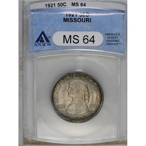 <B>1921<50C> Missouri MS64 ANACS.</B></I> Delightful rose, violet, and gold patina covers the surfaces of this classic commemorative. Well struck, though the luster is subdued.